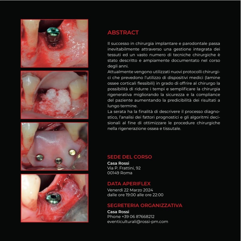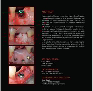 L'abstract dell'evento presenta un'anticipazione dei temi affrontati: "Il successo in chirurgia implantare e parodontale passa inevitabilmente attraverso una gestione integrata dei tessuti ed un vasto numero di tecniche chirurgiche è stato descritto e ampiamente documentato nel corso degli anni. Attualmente vengono utilizzati nuovi protocolli chirurgici che prevedono l’utilizzo di dispositivi medici (lamine ossee corticali flessibili) in grado di offrire al chirurgo la possibilità di ridurre i tempi e semplificare la chirurgia rigenerativa migliorando la sicurezza e la compliance del paziente aumentando la predicibilità dei risultati a lungo termine. La serata ha la finalità di descrivere il processo diagnostico, l’analisi dei fattori prognostici e gli algoritmi decisionali al fine di ottimizzare le procedure chirurgiche nella rigenerazione ossea e tissutale."