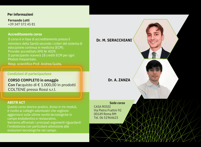 📚 Descrizione: Siamo lieti di annunciare un corso teorico-pratico, diviso in tre moduli, dedicato ai colleghi odontoiatri desiderosi di rimanere al passo con le ultime novità tecnologiche in campo endodontico e restaurativo.