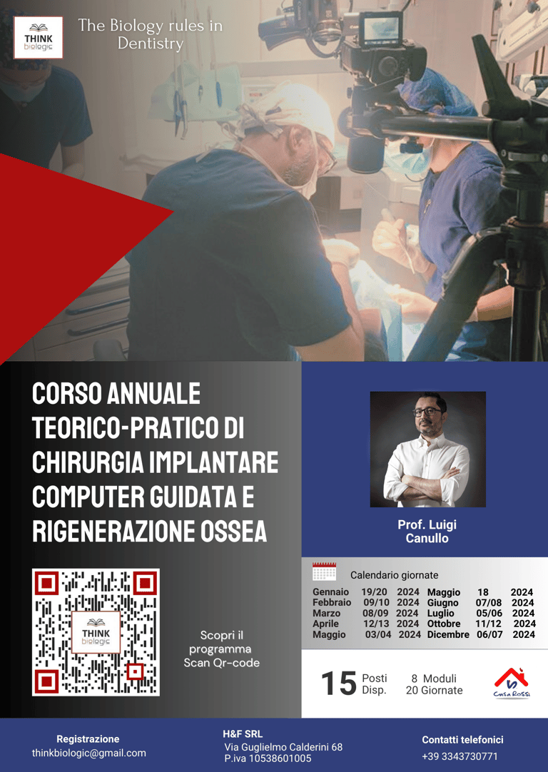 Sono inclusi nel costo de corso dima chirurgica, fixture, abutment, biomateriali per rigenerazione, completo chirurgico casacca e pantalone, la partecipazione come secondo operatore nel corso dell'anno agli interventi chirurgici del Prof. Canullo, 50 crediti ECM, la licenza temporanea per il software di pianificazione computer guidata, coffee break, spritz e supplì e il pranzo del sabato, due cene.